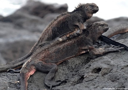 Bien que moins connu que les pinsons de Darwin ou les tortues géantes des Galápagos, l’iguane marin (Amblyrhynchus cristatus) est une espèce emblématique de ces îles à plusieurs titres. Elle est non seulement unique parce qu’elle est endémique de ces îles, mais surtout elle est la seule représentante de son groupe à avoir un mode de vie amphibien (ou semi-aquatique) ! Son alimentation, à l’âge adulte, est uniquement composée d’algues rouges et vertes qu’elle trouve sur les fonds marins et dans les zones intertidales. Elle est donc inféodée aux côtes, que ce soit des plages ou des falaises. Les mâles vont plus souvent se nourrir en s’éloignant de quelques mètres des côtes et en plongeant à plusieurs mètres de profondeur. Les femelles et les juvéniles se nourrissent plus souvent sur les rochers battus par l’eau et dans les zones intertidales.