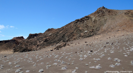Pour les îles plus récentes, le contrôle des écosystèmes se fait beaucoup plus par l’activité volcanique que par des effets climatologiques (le volcan Sierra Negra fait exception avec ses pentes Sud très humides et arborées et ses pentes Nord quasi désertiques). Selon la lithologie, seules quelques plantes bien spécifiques arrivent à se développer. Dans le cas de l’île Bartolome, les cendres et « tufs » sont colonisées par les espèces pionnières Tiquilla (Boraginacée) et Chamaesyce (Euphorbiacée), alors que les laves le sont par le cactus Brachycereus.