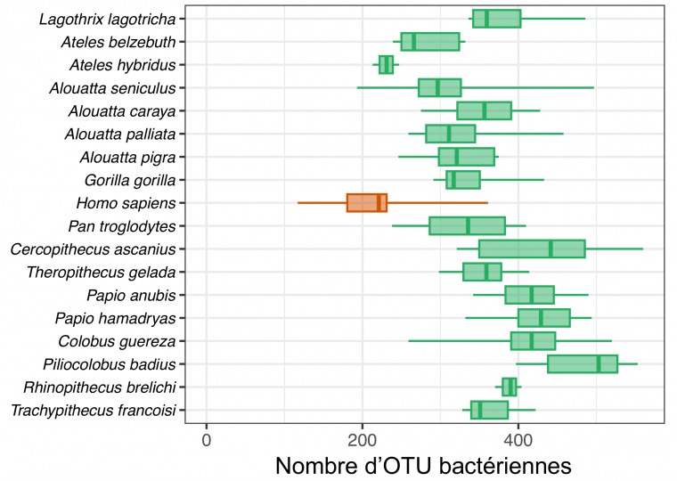 Nombre d’OTU bactériennes à 97 % dans le microbiote intestinal de différentes espèces de primates dont l’être humain (en orange). Chaque boîte à moustache représente la distribution du nombre d’OTU pour différents individus de la même espèce : la ligne principale indique la médiane, entourée par les premier et troisième quartiles tandis que les moustaches se prolongent jusqu’aux valeurs les plus extrêmes.