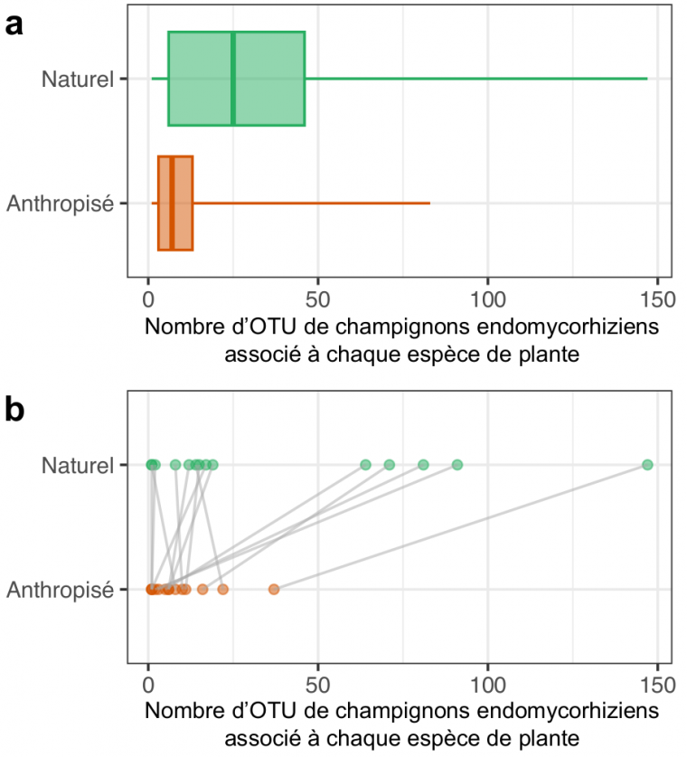b. Comparaison du nombre d’OTU endomycorhiziennes associé à 14 différentes espèces de plantes (lignes grises) étudiées à la fois en milieux naturel (vert) et anthropisé (orange) : parmi les 14 espèces, 10 interagissent avec moins d’OTU endomycorhiziennes en milieu anthropisé qu’en milieu naturel.
