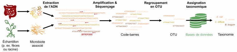 À partir d’un échantillon contenant des microorganismes, les molécules d’ADN de ces derniers sont extraites puis, grâce à des amorces spécifiques d’une région d’ADN (par exemple l’ARNr 16S pour les bactéries ou la région ITS pour les champignons), des codes-barres moléculaires sont amplifiés et séquencés. Sur ordinateur, les séquences d’ADN codes-barres obtenues sont ensuite regroupées par similarité sous forme d’unités taxonomiques opérationnelles (OTU) puis comparées à des bases de données afin de déterminer leur taxonomie. Dans cet exemple, quatre OTU sont détectées, chacune assignée à une espèce bactérienne. Cependant, les bases de données sont largement incomplètes car de nombreuses espèces bactériennes n’ont pas encore été décrites. Il arrive donc fréquemment qu’une OTU ne puisse être assignée à l’échelle de l’espèce, mais seulement à l’échelle du genre ou de la famille.
