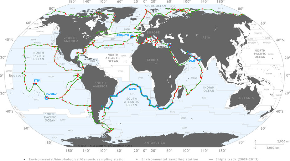 L’expédition Tara Océans (2009-2013) a eu pour objectif de découvrir la grande variété d’organismes planctoniques (des virus aux larves de poissons) de l’océan de surface (entre 0 et 200 m) et mésopélagique (200 à 1000 m) à l’échelle planétaire. Au total, 40 000 échantillons d’eau de mer et de plancton ont été prélevés dans 210 stations réparties dans 20 provinces biogéographiques. De nombreuses questions ont animé cette expédition : quelle est la vraie nature de la diversité planctonique dans nos océans ? Quels sont les organismes qui portent les fonctions les plus importantes ? Quel est l’effet des paramètres environnementaux et des interactions biotiques sur l’écosystème océanique ?