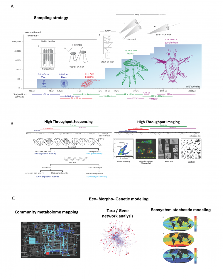 Les virus et les microorganismes ([de taille inférieure à] 3 micromètres) dominent numériquement les écosystèmes planctoniques marins avec 10 à 100 milliards de cellules dans chaque millilitre d’eau de mer. Leur rôle majeur dans les grands processus biogéochimiques est bien connu et il est donc important de cataloguer leur diversité biologique et fonctionnelle et comprendre comment ils sont affectés par leur environnement. Ces questions ont été abordées pour la première fois à l’échelle planétaire grâce à la métagénomique, c’est-à-dire au séquençage massif du matériel génétique issu de communautés entières de microorganismes. Les communautés de microorganismes de tailles variées et vivant à différentes profondeurs ont été prélevés dans l’ensemble des océans planétaires et des relevés de plusieurs paramètres physicochimiques de leur environnement ont été effectués en parallèle.