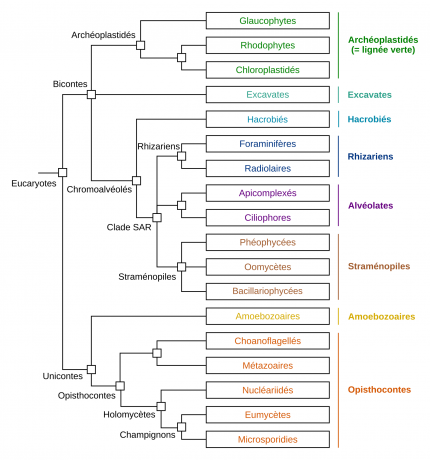 Les protistes forment un groupe polyphylétique correspondant aux eucaryotes unicellulaires. Les taxons représentés sont soit formés uniquement d'unicellulaires, soit d'unicellulaires et de pluricellulaires (par exemple, Chloroplastidés et Eumycètes). Seuls les Métazoaires ne contiennent que des êtres vivants pluricellulaires. Autrement dit, à l'exception du groupe des Métazoaires, on trouve des protistes dans tous les groupes d'Eucaryotes notés ici. D’après Lecointre et Le Guyader, 2016.