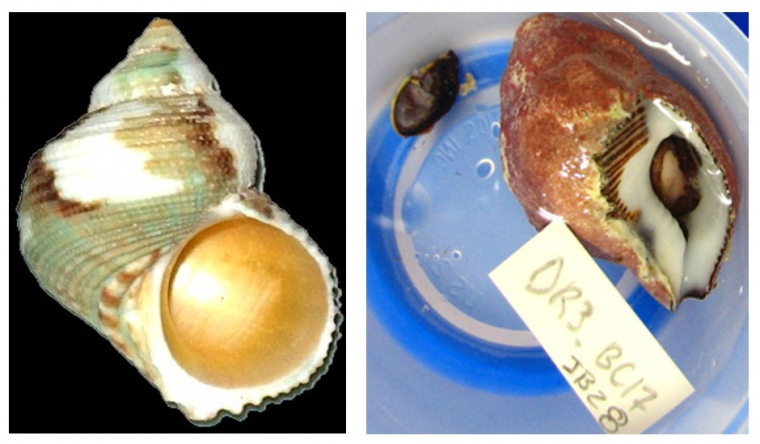 A droite: un Mitridae, avec le numéro d'identification et le morceau de tissu coupé