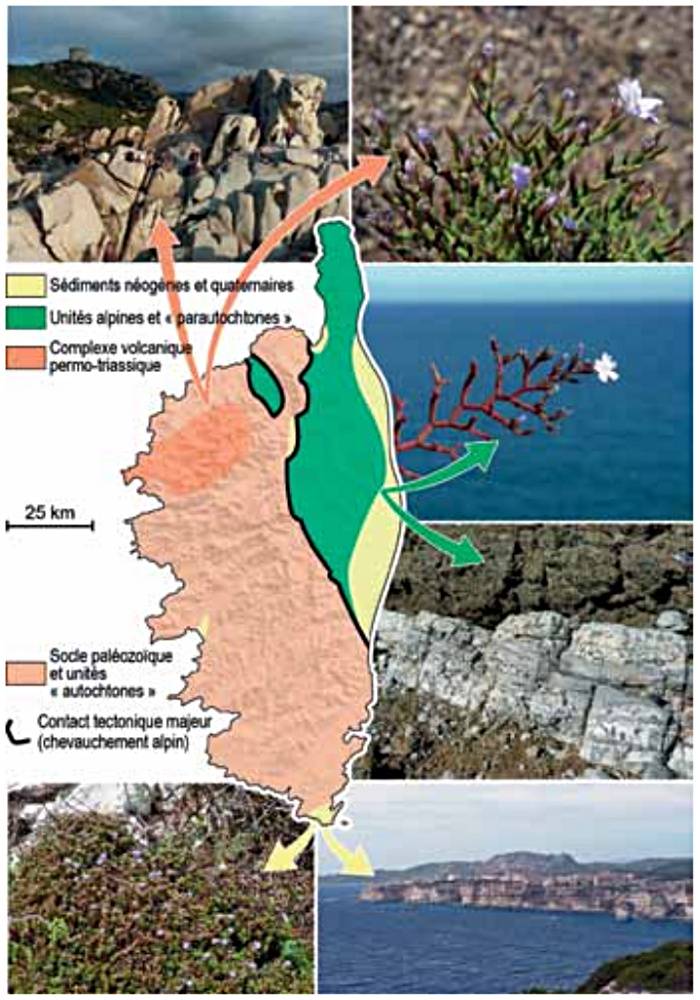 Le genre Limonium (Plumbaginaceae) comprend plusieurs centaines d'espèces qui se trouvent dans le monde entier. Certaines sont cosmopolites, d'autres montrent des exigences précises. Le cas de la Corse permet d'illustrer de fortes relations entre certaines espèces et un substrat rocheux particulier (Figure 3).
