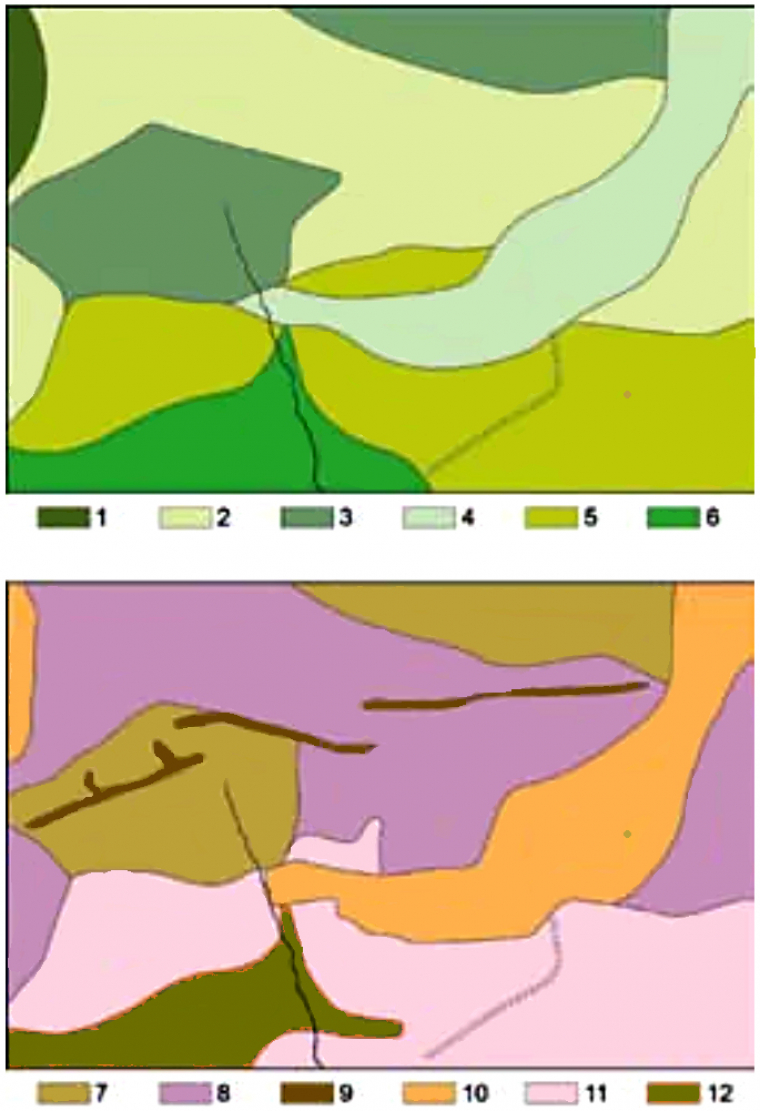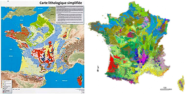 Une autre ressemblance est tout aussi frappante si la carte lithologique est mise à côté de la carte botanique. Alors qu'une carte géologique présente les roches par âges, une carte lithologique distingue les types de roches : sables, calcaires, granites… Avec la carte botanique ci-dessous, bien qu'un peu trop détaillée pour une comparaison facile, les relations entre lithologie et botanique sont évidentes.