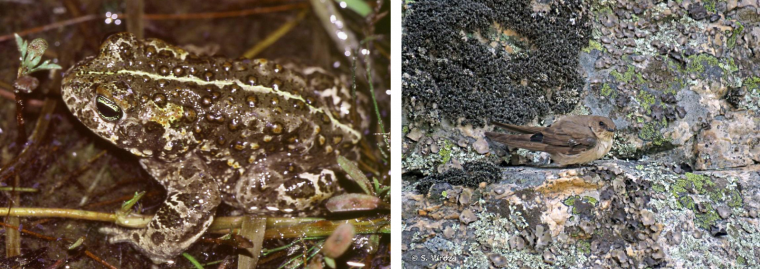 À droite : hirondelle des rochers (Ptyognoprogne rupestris). Crédit : S. Wroza, CC-BY-NC-SA, Inventaire national du patrimoine naturel.