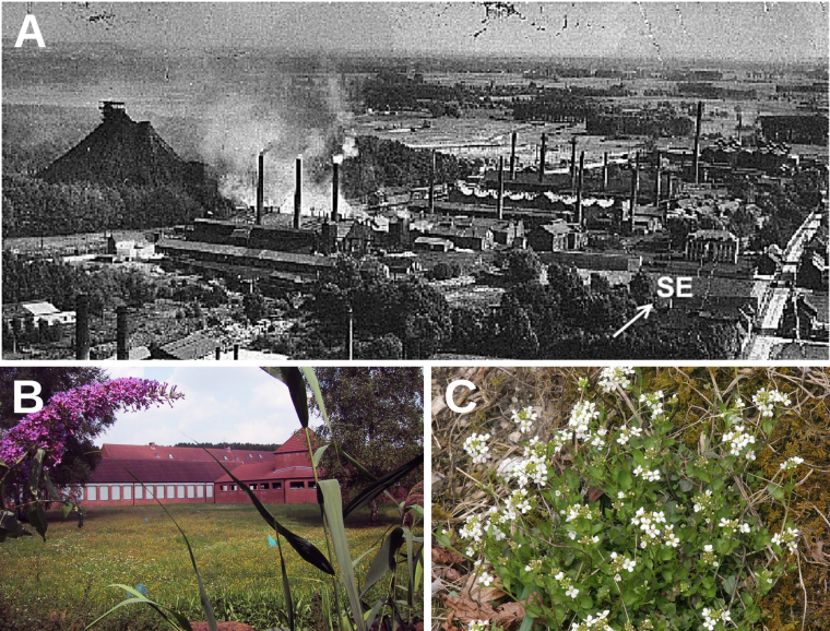 Un exemple peut être pris dans le Nord de la France. À la frontière franco-belge, au niveau de la confluence de la Scarpe et de l'Escaut, Mortagne-du-Nord occupait une situation stratégique qui lui valut, au début des années 1960, d'être le deuxième port de batellerie de France derrière Strasbourg (Figure 13). Au XIXe siècle, la proximité des mines de charbon du Hainaut franco-belge a permis un intense développement industriel. Ainsi, par exemple, s'est implantée une zinguerie qui a produit le tiers de la production française. Le minerai arrivait par l'Escaut. Le zinc n'est pas seul dans le minerai, le cadmium et le plomb, entre autres, lui sont habituellement associés. L'extraction des métaux et leur traitement utilisaient des acides forts et autres produits toxiques. Que ce soit par épandage accidentel, par ruissellement ou par les fumées des cheminées d'usine, ces métaux et leurs cortèges ont imprégné les sols et la végétation des environs, de même que les aquifères, très proches, et le fleuve. Les représentations véhiculées étaient sombres, pourtant au printemps toutes les pelouses, les fissures de trottoirs étaient spontanément fleuries jusqu'aux rebords des fenêtres. L'espèce la plus connue, Arabidopsis halleri (Figure 13C), était particulièrement tenace et trahissait la présence, même en très faible quantité, de zinc et de cadmium.