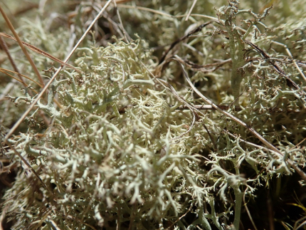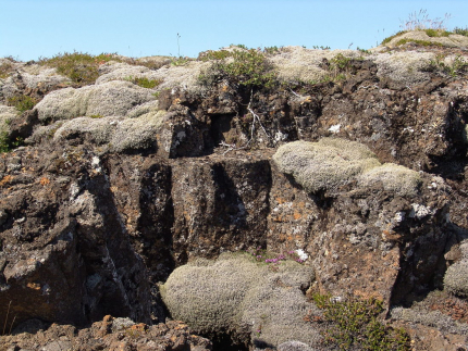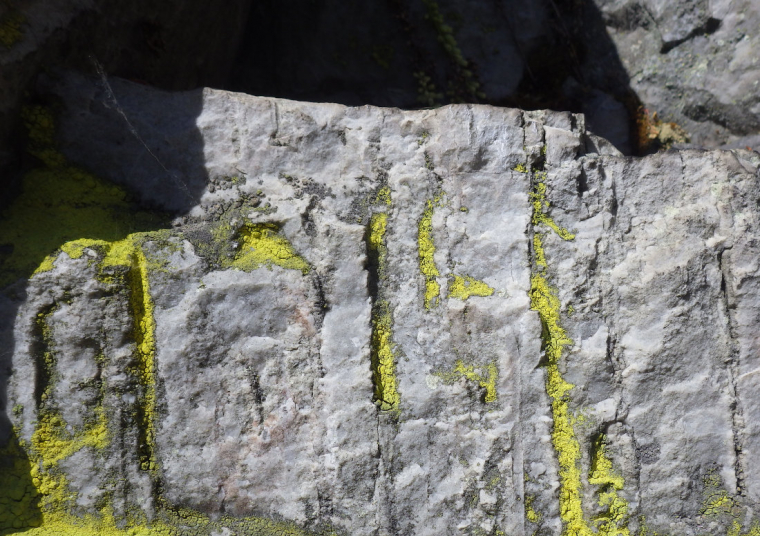 Affleurement rocheux, lieu d'observation du potentiel de biodiversité proche de la carrière, colonisé par des mousses et des lichens au niveau des fractures (Roc au Chien, Orne). Le lichen Chrysothrix chlorina, espèce stégophile (se développant dans des milieux non touchés par les précipitations) occupe ici préférentiellement d'anciens terriers verticaux (érodés) laissés par des annélides dans le sable du fond de la mer ordovicienne il y a 470 millions d'années (désormais un grès), terriers aujourd'hui partiellement protégés de la pluie.