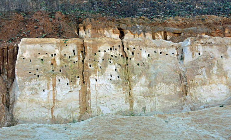 Les trous noirs dans la paroi de ce front de taille correspondent aux nids des hirondelles de rivage (Riparia riparia).