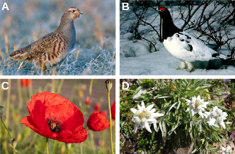 B : Le lagopède des saules (Lagopus lagopus), vit généralement au-dessus de 1800 m d'altitude.