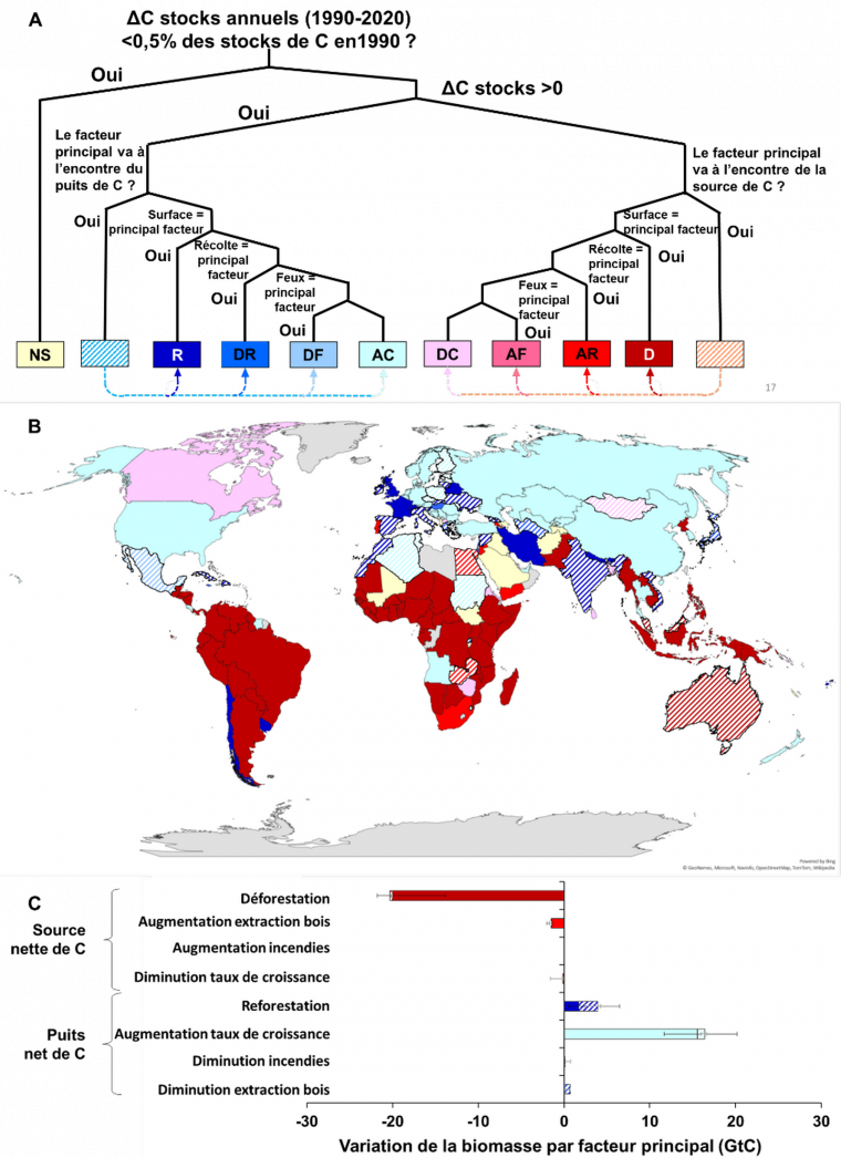 A. Pour chaque pays, les données de la FAO permettent de déterminer si la variation de son stock de carbone entre 1990 et 2020 est significative ou non (NS). Les pays peuvent présenter des variations de stock soit positives (cas des puits de carbone, couleurs bleues), soit négatives (cas des sources de carbone, couleurs rouges). Pour chaque pays, l’utilisation du modèle CRAFT pour établir des analyses contrefactuelles permet de déterminer la cause principale de la variation du stock de carbone. En bleu, les puits de carbone résultant principalement de R : la reforestation (expansion des surfaces de forêts) ; DR : la diminution de la récolte de bois ; DF : la diminution des feux de forêts ; AC : l’accélération de la croissance. En rouge, les sources de carbone résultant principalement de D : la déforestation ; AR : l’augmentation de la récolte de bois ; AF : l’augmentation des feux de forêts ; DC : la diminution de la croissance.