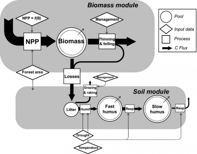 Le module de dynamique de la biomasse repose sur une relation parabolique entre la production primaire nette et la biomasse sur pied. Le module de biomasse est lié au module de sol par les pertes de biomasse vers la litière entraînées par la mortalité naturelle et la récolte. Le module sol – non utilisé dans le cadre de cette étude – est basé sur le modèle FORCLIM-D [9,10].