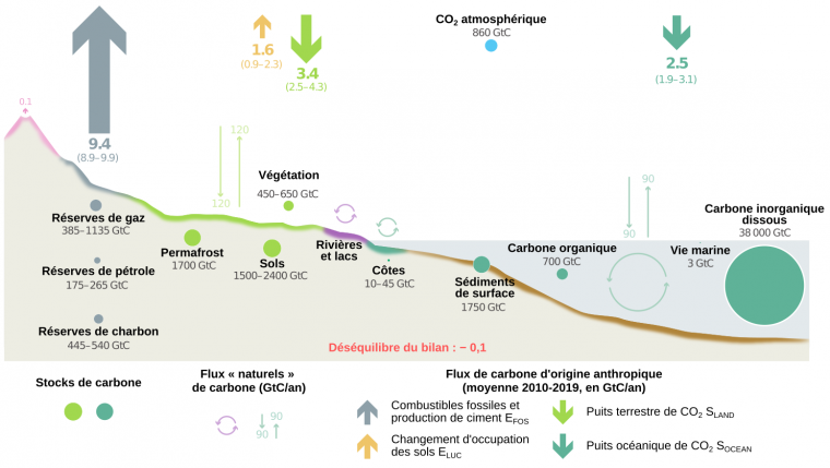 Les stocks de carbone sont représentés par des ronds tandis que les flux de carbone sont figurés par des flèches de différentes couleurs. Rose : volcanisme ; gris : combustibles fossiles et production de ciment ; jaune : changements d’occupation des sols (déforestation principalement) ; vert clair : flux net correspondant à la photosynthèse ; bleu-vert : flux net correspondant à la dissolution du carbone atmosphérique dans les océans.