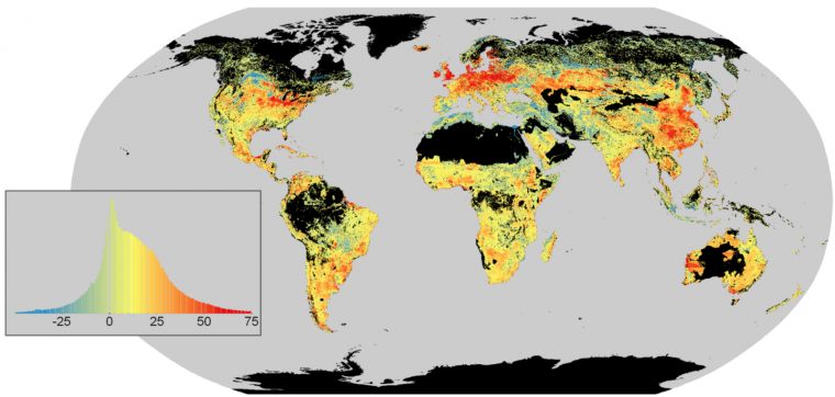 Le rouge correspond à des pertes, le bleu à des gains, exprimés en MgC · ha-1. Le rouge en Europe et en Amérique du Nord est une perte de carbone du sol lié à la mise en place de grandes cultures, notamment céréalières. Dans les régions de savane, la conversion de sols pauvres en sols agricoles grâce au chaulage, à la fertilisation et à la sélection des semences amène à des gains, comme c’est le cas au centre du Brésil.