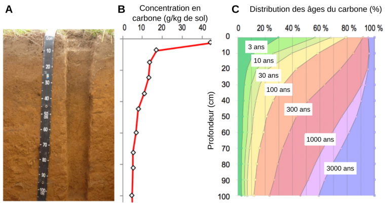 A. Profil de sol d’une prairie. B. La concentration en carbone décroît exponentiellement avec la profondeur, mais la contribution du sol profond (> 30 cm) au stock de carbone, bien que peu étudiée et donc présentant de grandes incertitudes, représenterait plus de la moitié du stock de carbone des sols. C. La partie superficielle du sol contient essentiellement du carbone entré récemment dans le sol. Plus la profondeur augmente et plus la proportion de carbone « ancien » est importante.