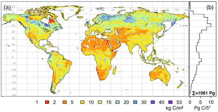 La figure (a) montre que les stocks de carbone organique du sol les plus importants se situent aux hautes latitudes et dans les régions montagneuses alors qu’ils sont faibles au niveau des déserts. La figure (b) donne la répartition de la masse de carbone en fonction de la latitude (avec un pas de 5°).