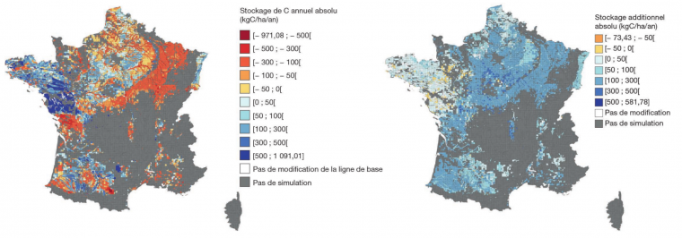 Ces figures sont issues de l'ouvrage Stocker du carbone dans les sols français. Quel potentiel au regard de l’objectif 4 pour 1 000 et à quel coût ?, Pellerin et coll., 2020, Éditions Quæ, Versailles, 232 p. Cet ouvrage est disponible gratuitement sur le site des Éditions Quæ et propose, en particulier, d'autres cartes de simulation du stockage de carbone additionnel qui pourrait être obtenu avec d'autres méthodes (semis direct, insertion de prairies temporaires…).