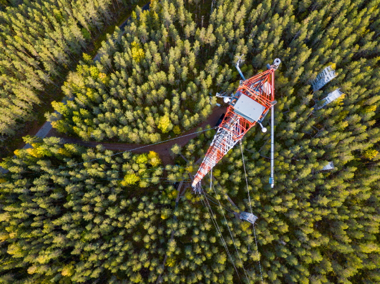 Une tour à flux permet d’estimer les flux de CO2 à l’échelle de l’écosystème local grâce à la mesure des flux verticaux de CO2 le long de la tour, corrigés des paramètres météorologiques, eux aussi mesurés continûment.