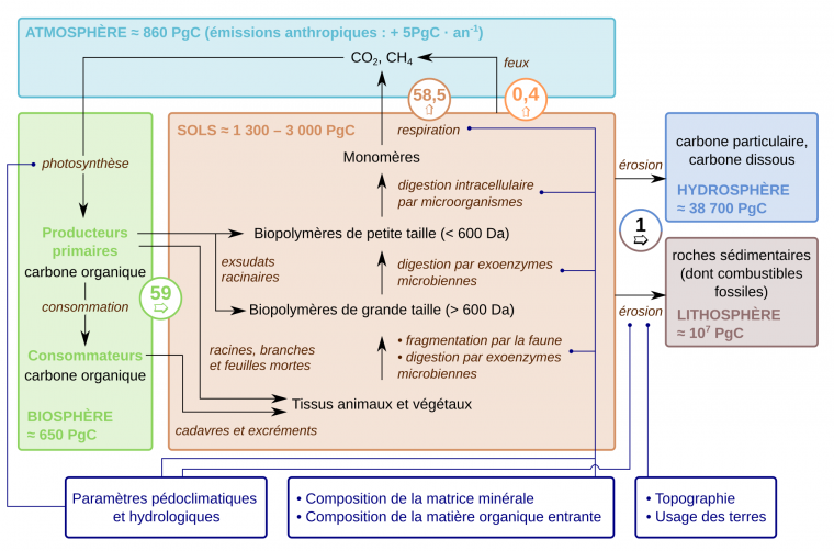 Seuls les flux permettant de comprendre l'évolution du stock de carbone des sols sont représentés. D'autres flux existent entre les autres réservoirs mais ne sont pas représentés. Les valeurs de flux de carbone entre réservoirs sont données à titre indicatif mais peuvent varier selon les études. En particulier, le flux de carbone vers les océans est très mal contraint. Pour le réservoir « sols », la valeur de 1 300 PgC correspond à la quantité de carbone organique présente dans le premier mètre de sol, tandis que celle de 3 000 PgC représente la masse totale de carbone des sols. Les paramètres qui contrôlent les flux de carbone dans et entre les réservoirs sont notés en bleu foncé.