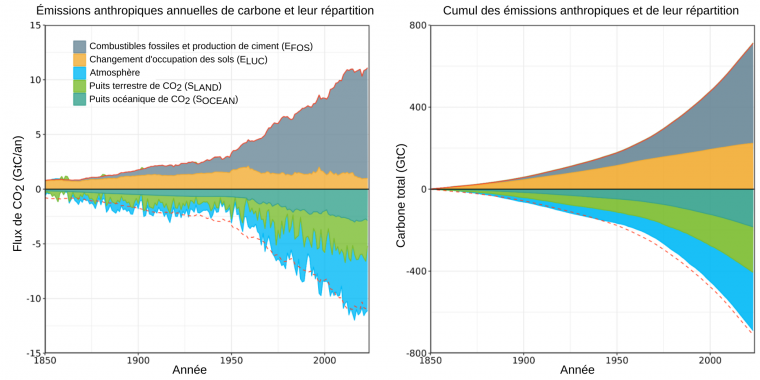 À gauche : flux annuels (en GtC/an). À droite : cumul des flux (en GtC) depuis 1850.
