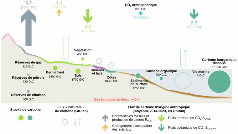 B. Flux de carbone d’origine anthropique (combustibles fossiles et production de ciment) et séquestration par l’atmosphère, les continents et les océans. Le bilan (émissions − répartition) n'est pas équilibré, ce qui traduit la difficulté de mesurer et de modéliser ces flux.