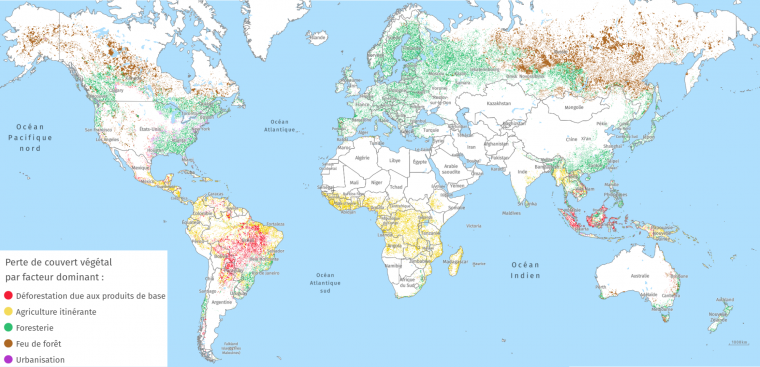 Une version interactive de cette carte est disponible sur le site Global Forest Watch. Les données sont issues de 1. NB : à cause d'un dysfonctionnement de l'application, les données ne s'affichent pas aux plus hautes latitudes Nord (extrême nord de la Russie et du Canada).