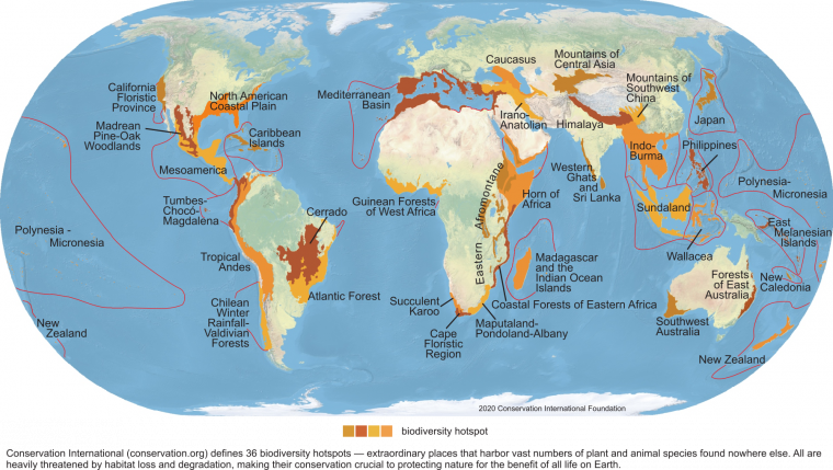 Ces 36 points chauds de biodiversité ne représentent que 2,5 % de la surface terrestre1, mais ils abritent plus de la moitié des espèces végétales et près de 43 % des espèces d’oiseaux, de mammifères, de reptiles et d’amphibiens de la planète 2. La forêt Atlantique, par exemple, abrite 2 960 espèces d’arbres, 719 d’amphibiens, 517 de reptiles, 1 025 d’oiseaux et 384 de mammifères avec des taux d’endémisme extraordinaires (70 % des amphibiens, 24 % des reptiles, 21 % des oiseaux et 28 % des mammifères y sont endémiques) 3. Ces espèces endémiques s’éteindraient si leur habitat venait à disparaître entièrement.