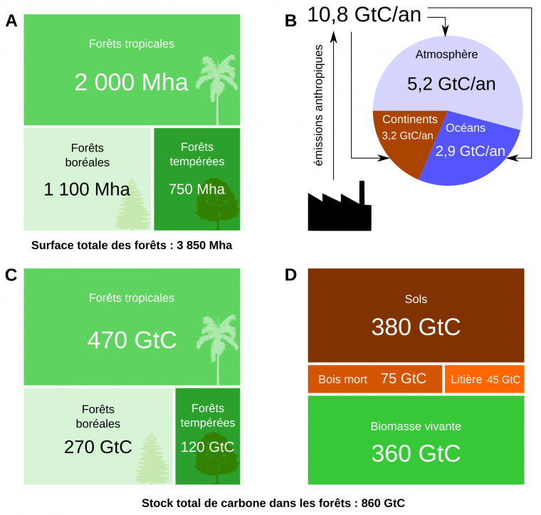 Source des données : A, C et D: Pan et coll., 2011, Science ; B : Friedlingstein et coll., 2024 Earth System Science Data. Remarque : Il existe beaucoup d’incertitudes sur les valeurs absolues des flux et stocks de carbone dans les forêts, ce qui explique des écarts parfois assez importants entre les estimations faites par différentes études scientifiques. En particulier, le stock de carbone des forêts estimé par Pan et coll. (860 GtC) est supérieur à celui estimé par le Global Carbon Project (450 GtC).