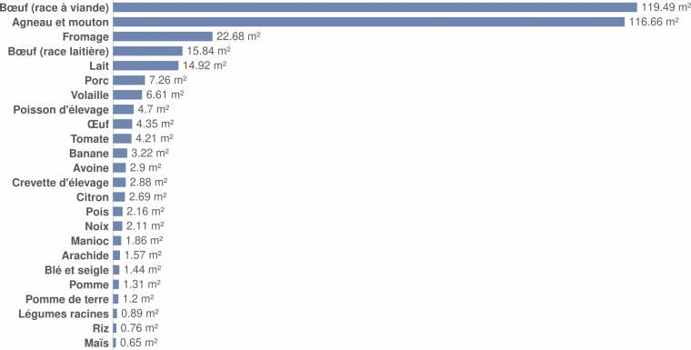 En 2018, 46 % des surfaces autrefois recouvertes par des forêts, des arbustes ou des prairies sauvages sont désormais utilisées pour l’agriculture. Sur ces surfaces, 23 % correspondent à des cultures directement consommées par les êtres humains, tandis que les 77 % restant servent au bétail (pâtures et cultures destinées à l’alimentation animale).