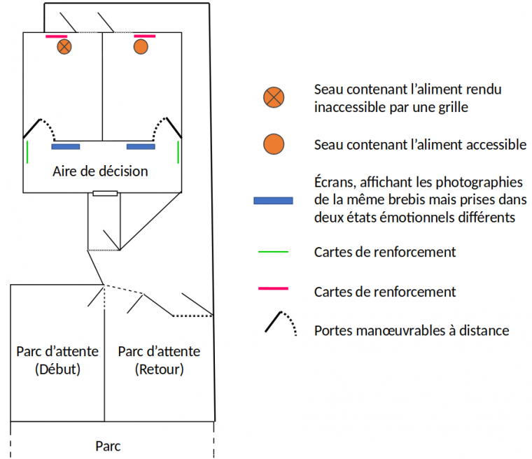 Le « labyrinthe à deux branches » utilisé pour l’exercice de discrimination est présenté ci-dessous (Figure 2). Une fois dans l’espace de décision, les animaux devaient choisir une des deux branches pour accéder à une petite récompense (une poignée de granulés très appétents). Le choix de la mauvaise branche était associé à la retenue dans le labyrinthe pendant 60 secondes, en présence d’un seau grillagé contenant de l’aliment rendu inaccessible. Pour chaque animal, une nuance de vert (clair ou foncé) ou un type d’image (neutre ou négatif) était associé à une récompense, et l’autre à l’erreur. L’indice récompensé changeait de côté entre deux passages dans le labyrinthe, en alternant aléatoirement, de manière à ce que la récompense ne soit pas associée à l’une des deux branches mais bien à un type d’indices. Une séance d’apprentissage consistait en 10 passages consécutifs dans le labyrinthe. Pour l’ensemble de l’étude, le critère d’apprentissage était fixé à 22 choix corrects minimum pour 30 passages consécutifs. Ce critère correspond au seuil à partir duquel on considère que l’animal a bien appris à discriminer les stimuli.