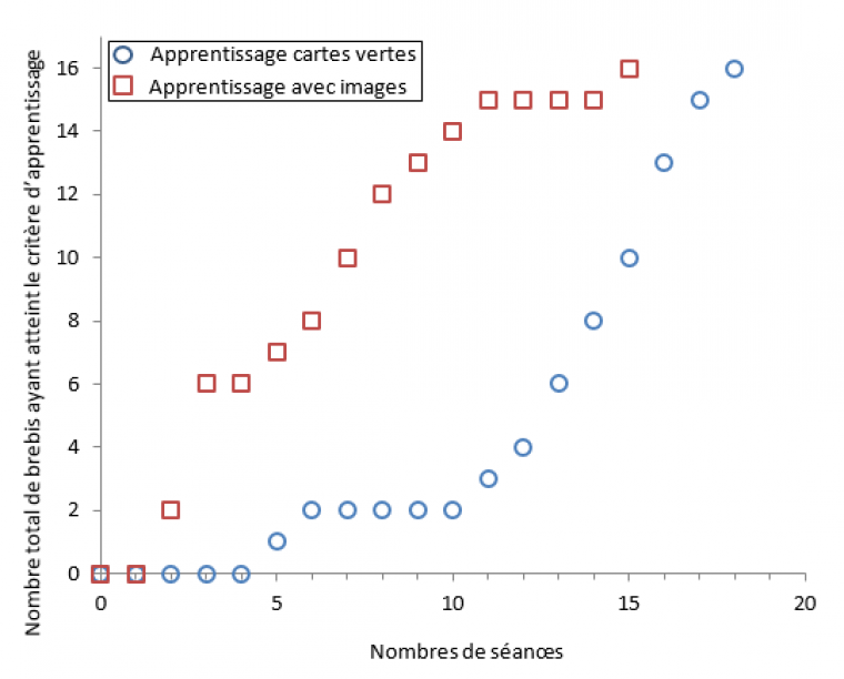 Le premier test de discrimination réalisé était celui avec les nuances de vert. Les brebis n’ayant pas réussi à atteindre le critère d’apprentissage après 18 séances, soit 180 passages dans le labyrinthe, ont été exclues de la suite de l’étude (46 % des brebis testées).