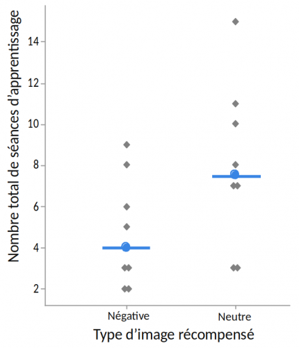 Le critère d’apprentissage est atteint par un animal lorsqu’il réalise au moins 22 choix corrects sur 30 passages. Chaque losange gris représente une des brebis testées. Les médianes de chaque groupe sont indiquées par la barre et le point bleus.