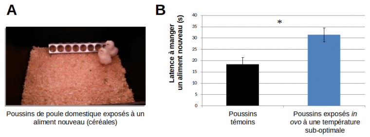 Des travaux récents montrent qu’une exposition répétée (deux fois 1h par jour) à une température sub-optimale (27°C) pendant le développement embryonnaire engendre des poussins plus enclins à exprimer de la néophobie alimentaire et spatiale (peur d’un environnement nouveau) [27]. En effet, des poussins exposés de manière chronique à une température sub-optimale pendant l’incubation montrent des latences d’approche d’un aliment nouveau plus longues que des poussins exposés in ovo à une température constante optimale de 37,8°C (poussins témoins) (Figure 1).