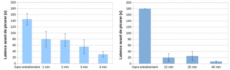 Les barres représentent le temps moyen mis à picorer un nouvel aliment bleu après une période d’entraînement durant laquelle un nouvel aliment coloré en rouge est présenté. La durée de l’entraînement peut être courte (à gauche, de 0, 1, 2, 3 ou 4 minutes passées avec le nouvel aliment rouge) ou longue (à droite, de 0, 12, 25 ou 40 minutes passées avec le nouvel aliment rouge). Les barres d’erreur représentent l’erreur standard. D’après Marples et al., 2007.