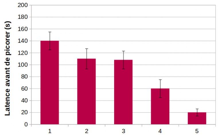 Les barres représentent le temps moyen mis à picorer (s) un nouvel aliment après un entraînement durant lequel un nouvel aliment d’une autre couleur est présenté. Groupe 1 : témoin. Groupe 2 : observation du nouvel aliment pendant 4 × 3 min. Groupe 3 : observation de conspécifiques mangeant le nouvel aliment pendant 4 × 3 min. Groupe 4 : 4 × 3 min à manger le nouvel aliment, seul. Groupe 5 : 4 × 3 min à manger le nouvel aliment, seul, suivi de 48 minutes de recherche de nourriture en groupe. Les barres d’erreur représentent l’erreur standard. D’après Marples et al., 2007.