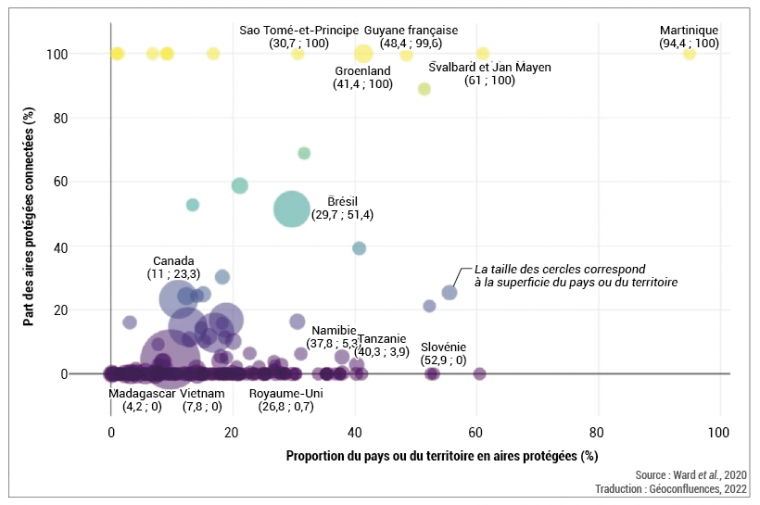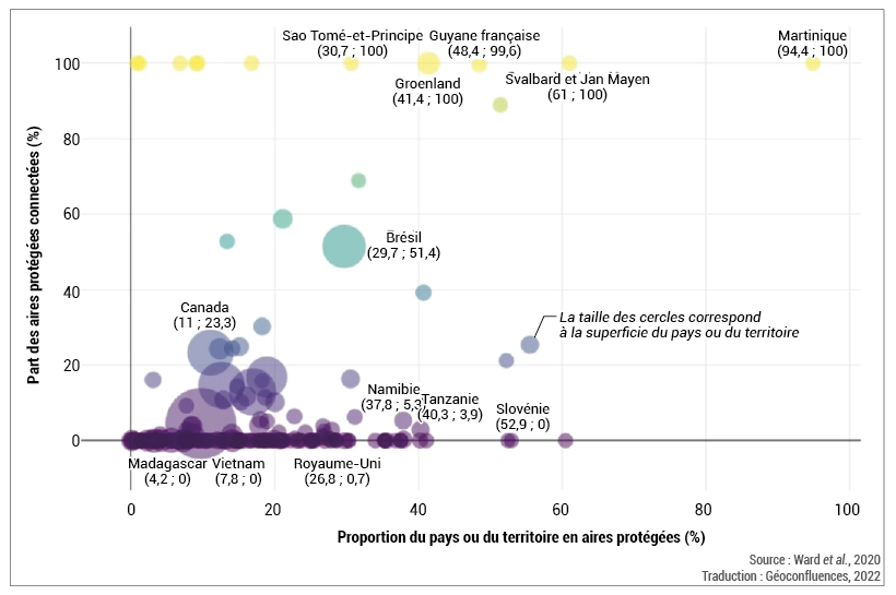 Lors de la conférence sur la biodiversité à Nagoya en 2010, un nouveau Plan stratégique est adopté pour tenter une nouvelle fois de ralentir le déclin des espèces animales et végétales à l’échelle mondiale. Pour la première fois, l’objectif n’est pas seulement d’inciter à la création d’aires protégées, mais de penser la conservation au moyen « de réseaux écologiquement représentatifs et bien reliés d’aires protégées […] intégrées dans l’ensemble du paysage » (objectif d’Aichi n° 11). Aujourd’hui, tous dispositifs confondus, les aires protégées couvrent environ 15 % des surfaces terrestres dans le monde (UNEP-WCMC et coll., 2020), mais leur mise en connexion reste largement en-dessous de l’objectif d’Aichi qui était d’au moins 17 % des zones terrestres à l’horizon 2020. Ward et coll. (2020) estiment que moins de 10 % des zones protégées sont structurellement connectées par des milieux de haute naturalité. Ce chiffre global n’est d’ailleurs lié qu’à un petit nombre de territoires (Martinique, Sao Tomé-et-Principe, Groenland, Guyane française, Brésil, etc.) dont plus de 50 % des aires protégées sont considérées comme connectées (Figure 4). Ce fort pourcentage s’explique par la présence d’un très petit nombre d’aires protégées, souvent vastes et d’un seul tenant dans des territoires peu anthropisés. La grande majorité des autres pays et territoires n'ont qu'un faible pourcentage d’aires protégées structurellement connectées car celles-ci sont peu nombreuses ou disséminées sur le territoire et séparées par des milieux fortement anthropisés.