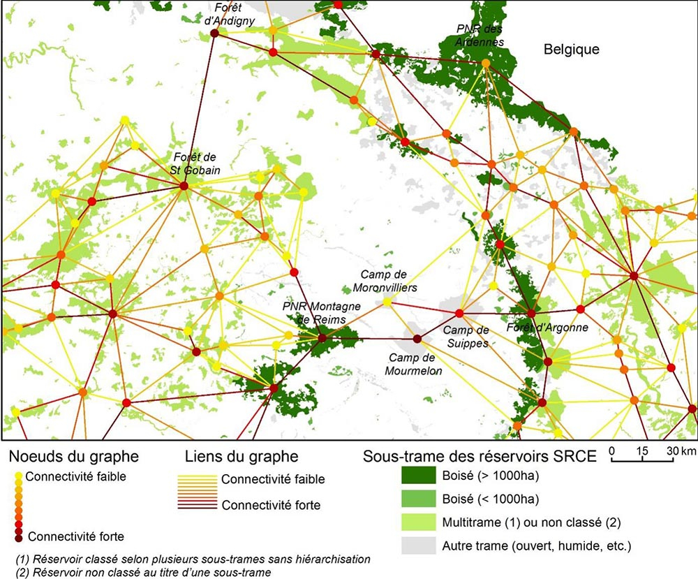 Le bilan des schémas régionaux de cohérence écologique révèle une grande diversité de méthodes et de critères pour définir et cartographier les réservoirs de biodiversité et les corridors entre les régions, mais aussi au sein d’une même région entre les différentes sous-trames. Cette hétérogénéité rend difficile une comparaison de la trame verte et bleue à l’échelle interrégionale et complexifie sa prise en compte dans l’aménagement du territoire, notamment pour les régions fusionnées par la loi NOTRe (2016). Bien que l’objectif de cette trame soit de préserver la fonctionnalité des continuités écologiques, la majorité des régions s’est focalisée sur la connectivité structurelle sans tenir compte des capacités de déplacement des espèces (Sordello et coll., 2017). Récemment, une étude exploratoire mobilisant la modélisation spatiale par la théorie des graphes a proposé une méthode reproductible, applicable aux différentes sous-trames, pour intégrer la connectivité fonctionnelle dans la gestion de la trame verte et bleue à différentes échelles spatiales (Clauzel et Bonnevalle, 2019). Le recours à des données génériques et à une méthode standardisée permet d’identifier les réservoirs et les corridors de manière homogène sur l’ensemble du territoire et de s’affranchir des limites administratives régionales. La méthode apporte aussi des informations sur la capacité des réservoirs et des corridors à maintenir la fonctionnalité du réseau écologique à une échelle globale. Ainsi, la figure 7 souligne le rôle majeur des forêts de la Montagne de Reims, de Saint-Gobain et d’Argonne (nœuds du graphe de couleur marron) qui sont connectées à de nombreuses autres taches d’habitat forestier. Elle révèle également des connexions fragiles entre les deux grands ensembles forestiers séparés par des milieux agricoles. Seuls deux corridors forestiers sont potentiellement fonctionnels pour la faune : l’un continu mais très étroit le long de la vallée de l’Oise entre la forêt de St Gobain et la Forêt d’Andigny, l’autre discontinu entre le parc naturel régional de la Montagne de Reims et la forêt d’Argonne s’appuyant sur la présence de bosquets dans les camps militaires de Mourmelon et Suippes.