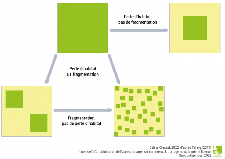 La fragmentation des habitats est un processus spatial qui transforme une surface continue d’habitat en plusieurs fragments de taille variable. Ce morcellement s’accompagne souvent d’une diminution de la quantité totale d'habitat dans le paysage (Figure 1, au centre), sans que cela soit toutefois systématique (Figure 1, en bas). Les deux processus (morcellement et perte de surface) sont ainsi souvent confondus, conduisant à des débats scientifiques sur les effets positifs ou négatifs de la fragmentation sur les espèces1.