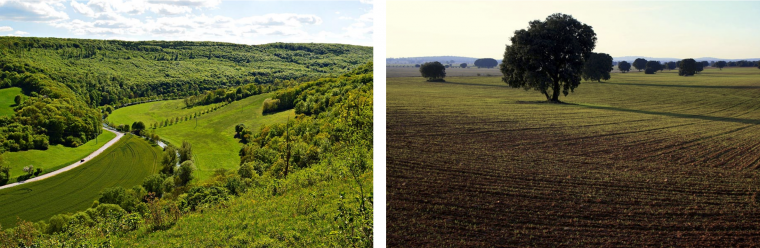 Exemple de paysage boisé (Thuringe, Allemagne) avec un degré de connectivité élevé pour les espèces forestières, et de paysage ouvert (la Manche, Espagne), avec un degré de connectivité faible pour les espèces forestières.