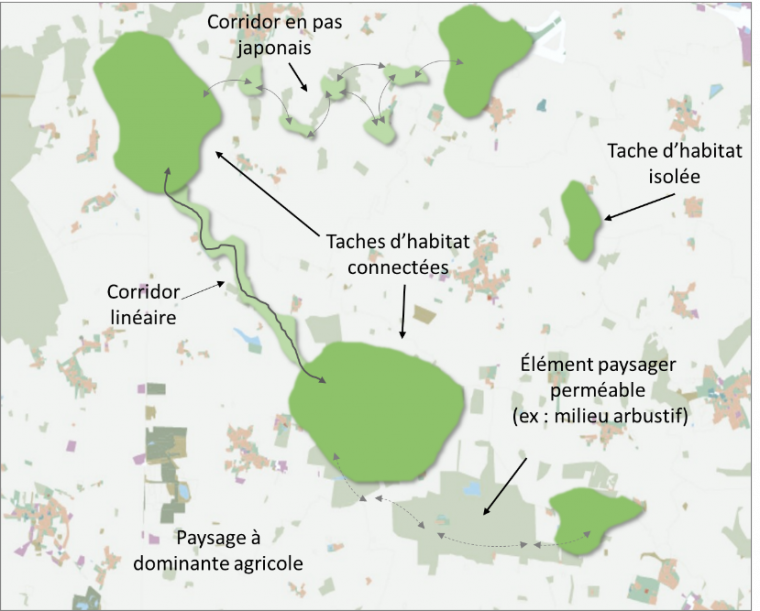 Les nouveaux dispositifs pour penser la conservation à l’échelle des territoires s’appuient sur la reconnaissance des réseaux écologiques constitués de zones protégées à des degrés divers et de corridors permettant aux espèces de se déplacer entre leurs habitats. Un réseau écologique renvoie ainsi à l’espace fonctionnel au sein duquel une espèce peut réaliser l’ensemble de son cycle de vie. Il comprend à la fois les différents habitats qu’une espèce peut occuper au cours de sa vie et les milieux facilitant ses déplacements quotidiens, annuels ou intergénérationnels. Ainsi, dans un paysage par exemple à dominante agricole, un réseau écologique « forestier » serait constitué (Figure 5) :