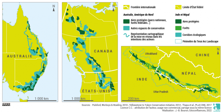 Les réseaux écologiques couvrent des échelles spatiales et temporelles variées en fonction des processus impliqués. Les dispositifs transnationaux visent généralement à préserver les capacités de déplacement des espèces à forte mobilité, souvent considérées comme des espèces emblématiques connues dans le monde entier (« espèce porte-drapeau »). Le Terai Arc Landscape entre le Népal et l’Inde a par exemple pour objectif de relier, sur 810 km, 14 aires protégées forestières abritant entre autres le tigre du Bengale, le rhinocéros indien et l’éléphant d’Asie (Figure 6). Entre les États-Unis et le Canada, le Yellowstone to Yukon Conservation Initiative vise à maintenir et restaurer des habitats naturels variés et des corridors pour le grizzli, le caribou ou le lynx sur 3 200 km. En Afrique australe, les Transfrontier Parks doivent permettre une libre circulation des animaux sauvages indépendamment des frontières grâce à une gestion coordonnée entre les pays concernés (Guyot, 2006).