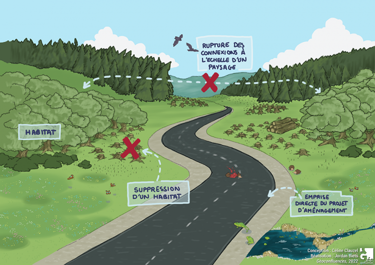 Depuis le Sommet de Rio en 1992, un grand nombre de pays ont adopté un objectif d’« absence de perte nette » de biodiversité et ont mis en place des démarches visant à éviter, réduire et compenser les atteintes environnementales des projets d’aménagement (« séquence ERC »). Les pertes et les gains de biodiversité y sont souvent évalués en termes de surface d’habitat détruit ou restauré dans le périmètre d’influence directe du futur projet (Regnery et coll., 2013). Or, si l’implantation d’un projet se traduit mécaniquement par la destruction d’une certaine surface d’habitat, elle peut également engendrer des effets moins visibles sur le déplacement des espèces en rompant des connexions entre des habitats situés à l’extérieur du périmètre étudié (Figure 8). Dès lors, l’évaluation environnementale ne peut pas tenir compte uniquement des espèces localisées sur l’emprise du projet et faire abstraction des enjeux écologiques à l’échelle du paysage. Les différentes mesures doivent être pensées de façon anticipée et à une échelle plus large que le site d’implantation du projet pour être en cohérence avec les processus et les interactions écologiques (Bigard et coll., 2020). Dans cette perspective, les travaux récents sur la modélisation spatiale des réseaux écologiques apportent des méthodes et des outils pour intégrer la connectivité fonctionnelle dans la planification territoriale en évaluant les atteintes par la « quantité d'habitat atteignable à l'échelle du paysage », un indicateur de connectivité tenant compte à la fois de la surface et de la qualité des taches d’habitat ainsi que de leur degré de connexion. Il devient ainsi possible d’identifier les secteurs d’implantation d’un projet qui minimisent les conséquences sur la connectivité fonctionnelle et les secteurs pour la mise en œuvre des mesures de réduction et de compensation afin de restaurer et améliorer la connectivité (Tarabon et coll., 2020).