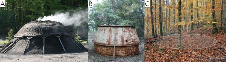 A : Échappement des fumées par la colonne centrale de la meule lors de la carbonisation. B : Four de combustion en métal. C : Matérialisation d’une plateforme de charbonnière en forêt des Vosges du Nord.