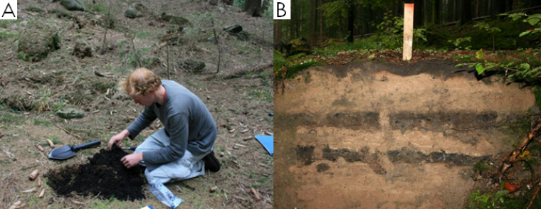 A : Échantillonnage d’une charbonnière. B : Charbonnière avec trois niveaux de charbon.