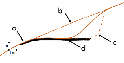 a : surface actuelle, b : surface pré-utilisation, c : surface durant l’utilisation, d : niveau/horizon de charbon.