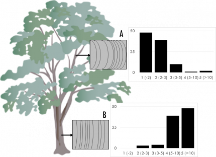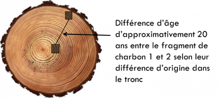 Certains fragments de charbon de bois peuvent être assez gros pour présenter des séries de cernes de bois bien visibles. Des mesures du degré de courbure de ces cernes peuvent être réalisées pour identifier le type de bois brûlé et par extension le type de structure du peuplement forestier d’où est originaire le combustible ligneux (Haneca et al. 2005).