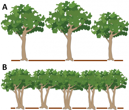 A : futaie (troncs de francs pieds) ; B : taillis (troncs de cépées)