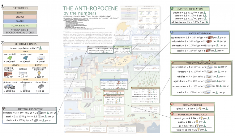 L’Anthropocène désigne la période géologique actuelle, marquée par l’empreinte de l’espèce humaine sur la Terre (modification de la biodiversité, changement climatique…). Sa définition géologique et sa date de début sont les objets du groupe de travail sur l’Anthropocène de la Commission internationale de stratigraphie. La première page de l’infographie illustre les grandes estimations quantifiant l’échelle de nos impacts sur la planète (l’intégralité de l’infographie est disponible dans la section SnapShot d’Anthroponumbers.org). (A) Les estimations sont présentées sous cinq catégories : Terre, Énergie, Eau, Faune & Flore, Cycles atmosphériques & biogéochimiques. (B) Les valeurs des estimations sont rapportées non seulement dans les unités scientifiques internationales, mais aussi dans des unités plus simples à appréhender. (D, E, L, N, O, P) Quelques exemples d’estimations intéressantes sont mises en valeur.